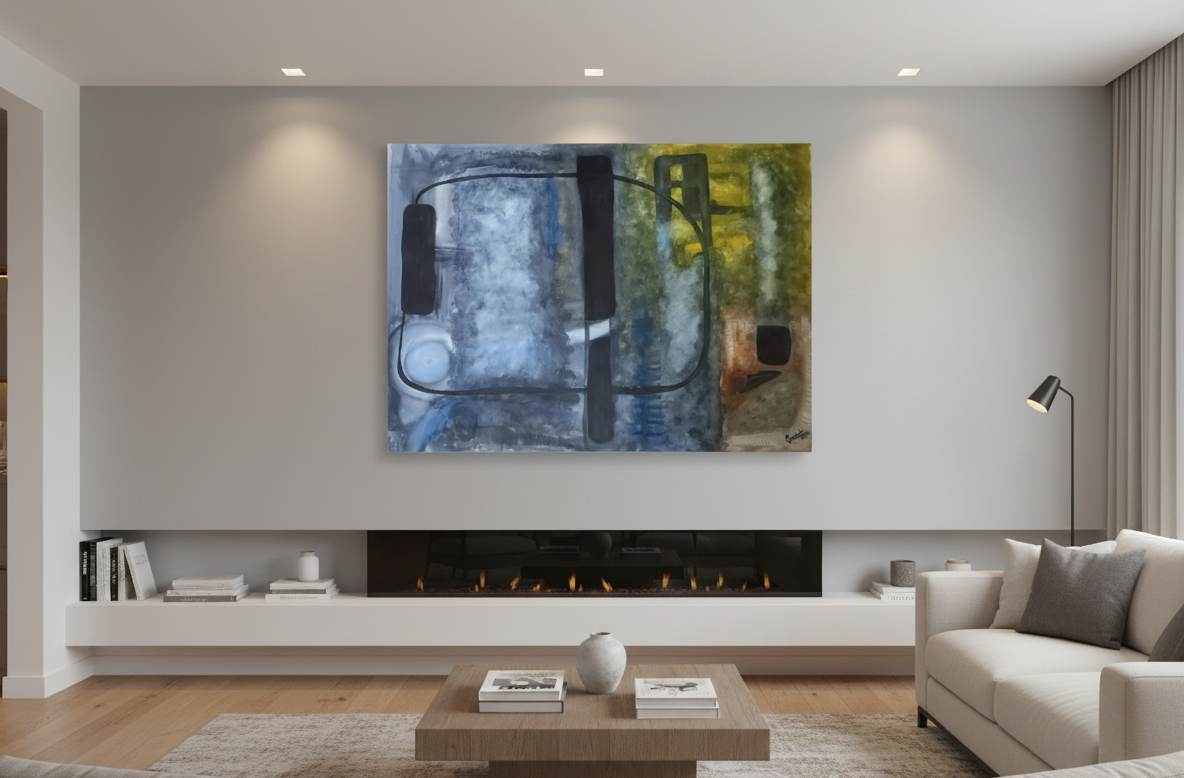 Esta Arte abstrata contemporânea de 2025, propõe um diálogo sofisticado entre estrutura e fluidez, onde gestos orgânicos convivem com formas geométricas sutis. A composição é marcada por linhas negras que delimitam o espaço pictórico como um mapa sensível, sugerindo trajetos, conexões e pausas — quase como um pensamento em movimento.